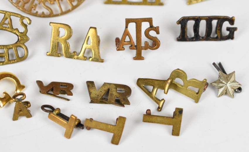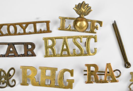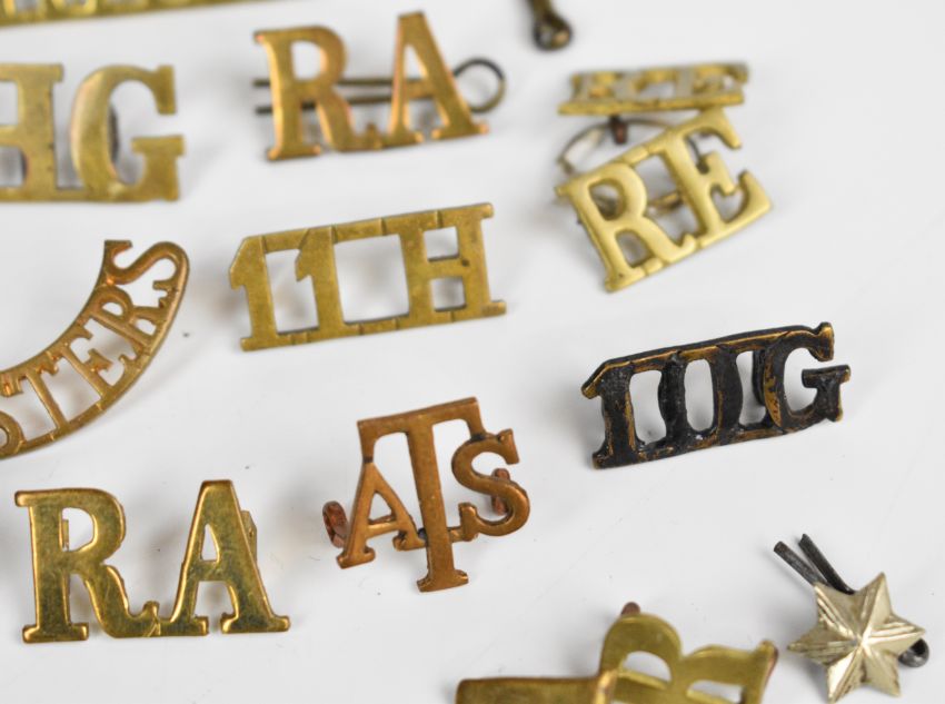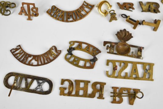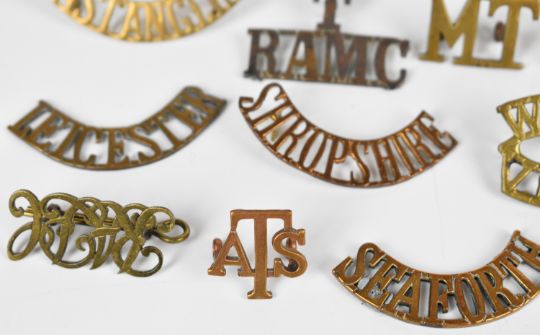 Approximately 30 shoulder titles and insignia including Shropshire, Territorial RAMC, Foresters, Lancashire Fusiliers, Royal Artillery, Royal Horse Guards, King's African Rifles, Leicester, RASC, ATS, Royal Engineers, KOYLI, East Anglia, WAASVLHD, CMP, Seaforth,