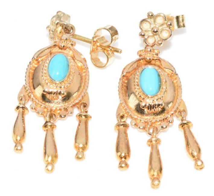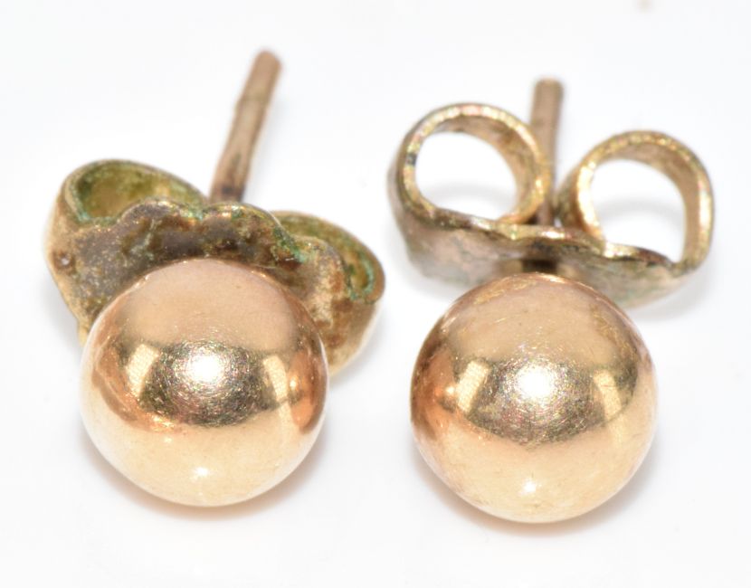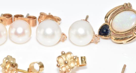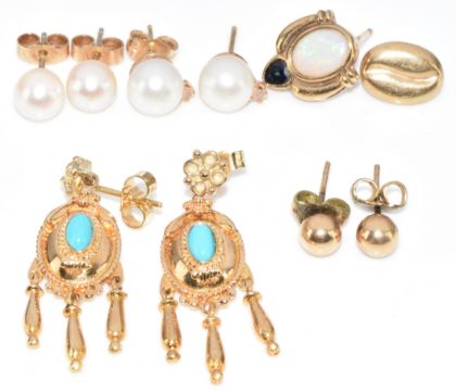 A pair of 14k gold earrings set with turquoise (4.8g), two pairs of 9ct gold pearl studs, 9ct gold studs and two single 9ct gold earrings  (4.6g)