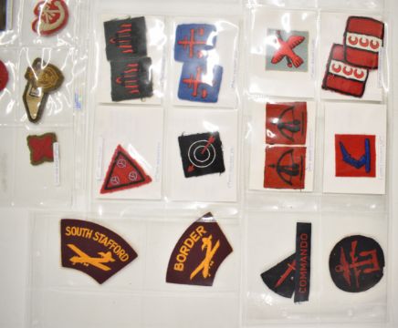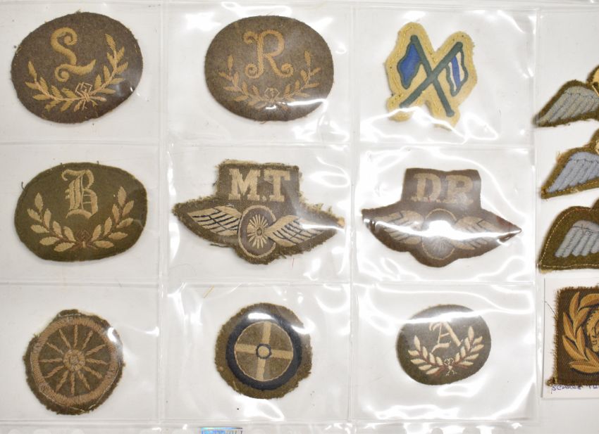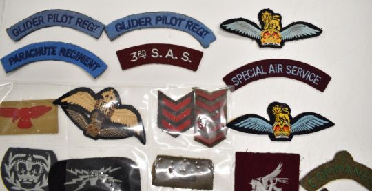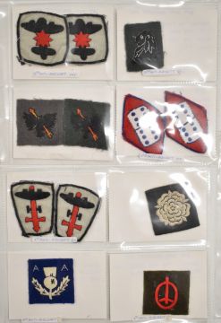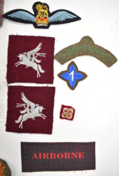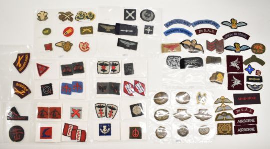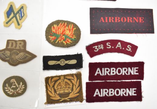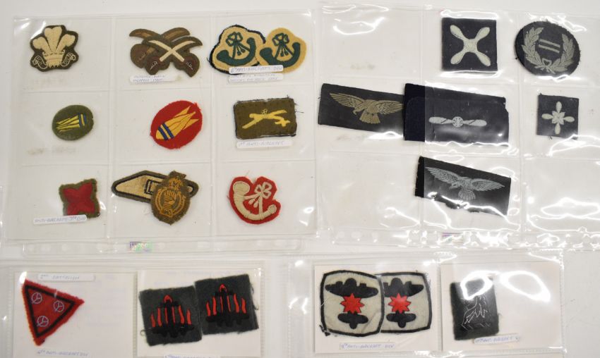 Approximately 80 cloth insignia, mainly RAF, Air Force, Airborne and SAS related including SAS, 3rd SAS, Airborne, Parachute Regiment, Parachute Wings, Airborne Pegasus and Glider Pilot Regiment, together with a collection of anti-aircraft patches including 1st, 3rd, etc Anti-Aircraft Corps, 1st, 3rd, 4th 8th, 10th, etc Anti-Aircraft Division patches, in annotated folder with brief history on the division / regiment, together with other British patches including qualification patches, tank patches, printed Warrant Officer patch, etc