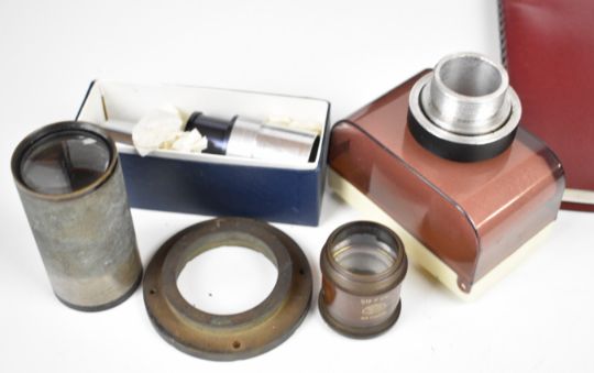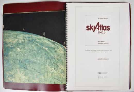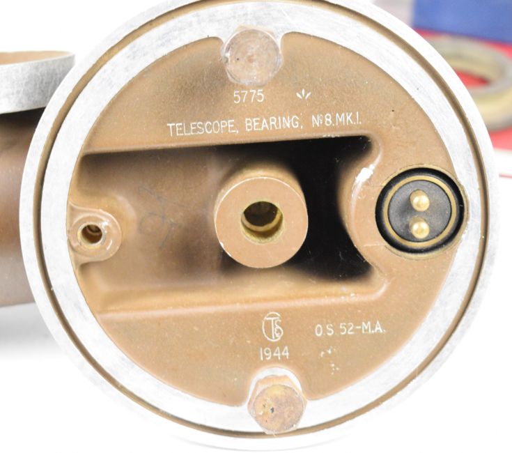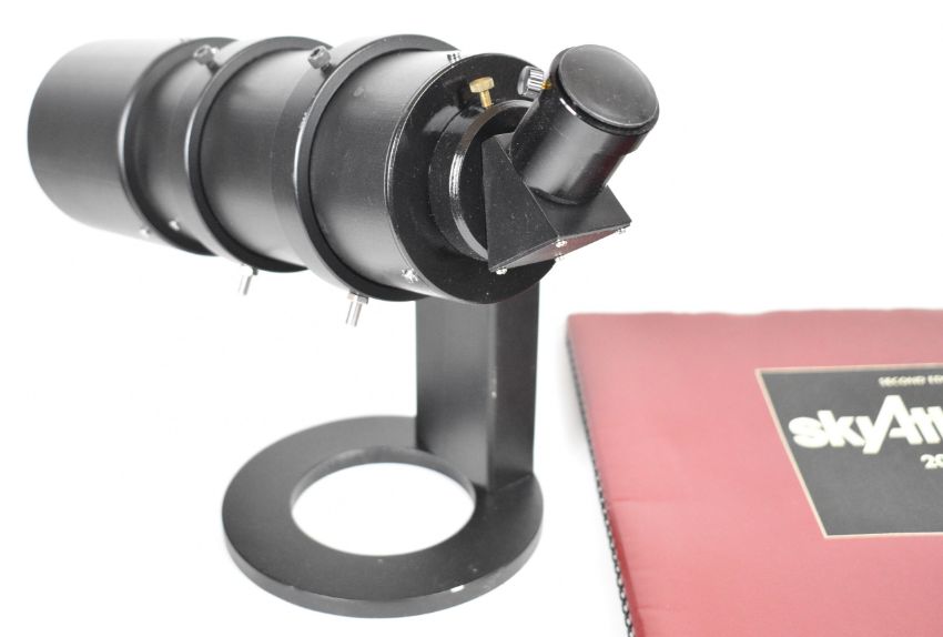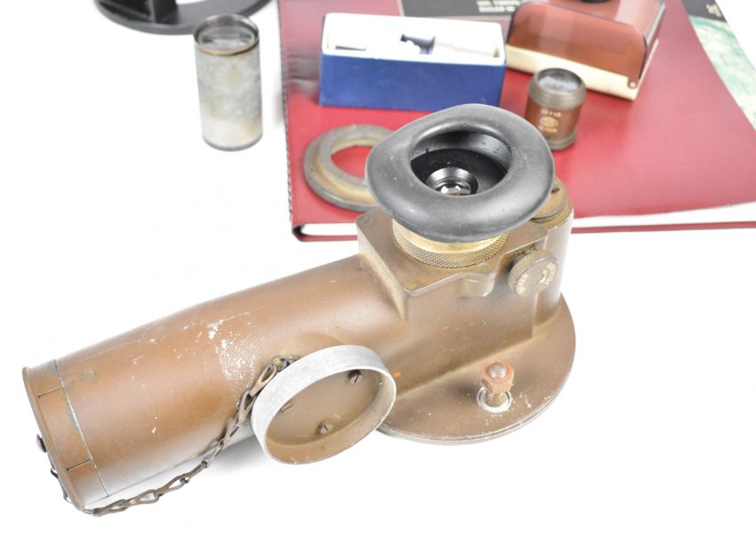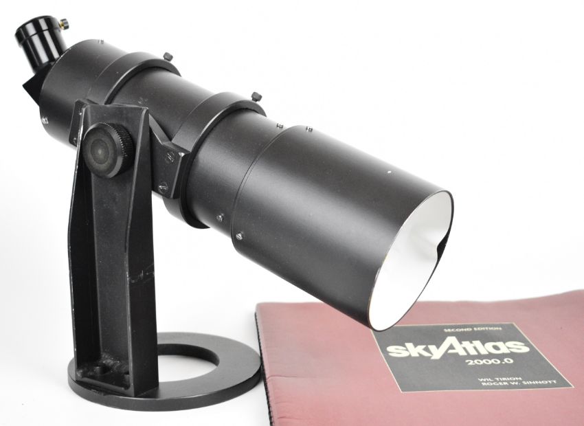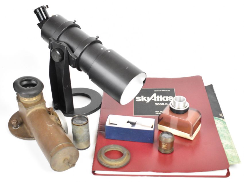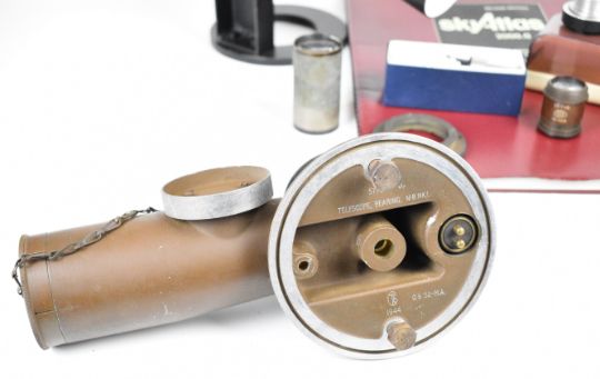 Refractor telescope, approximate diameter 10cm with two Olympus eyepieces, WW2 telescope military bearing No 8 Mk 1 sight or telescope, dated 1944, Sky Atlas by Wil Tirion and Roger W. Sinnott, Ross 5in f 4.5 lens and a Dallmeyer projection lens
