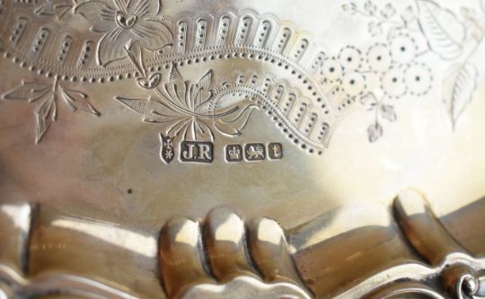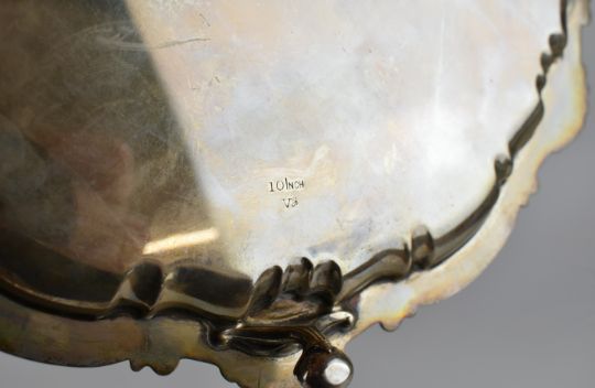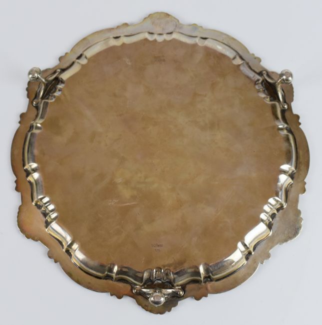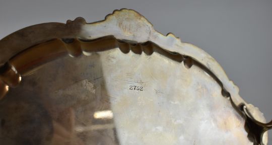 George V hallmarked silver salver with shaped edge and engraved decoration, raised on three ball and claw feet, Sheffield 1911, maker Joseph Rodgers & Sons, diameter 26.5cm, weight 533g
