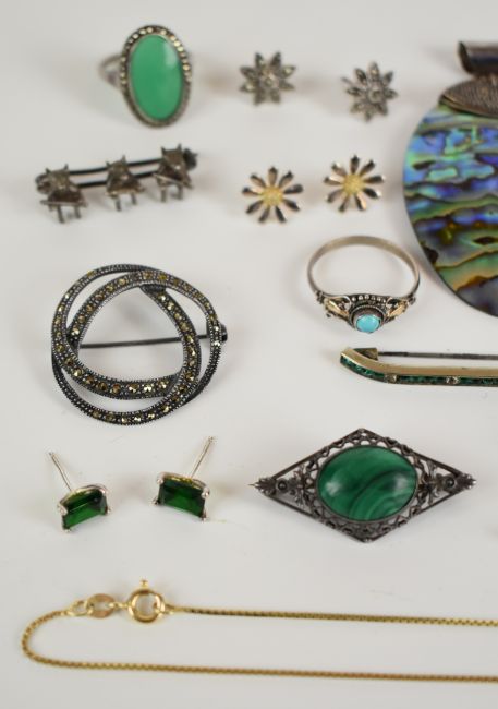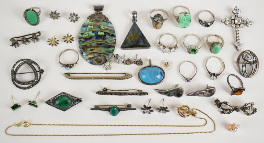 A collection of silver jewellery including eleven rings set with moss agate, green agate, pressed amber, cubic zirconia etc, six pendants, six brooches, seven pairs of earrings and an Art Deco paste brooch, 118g