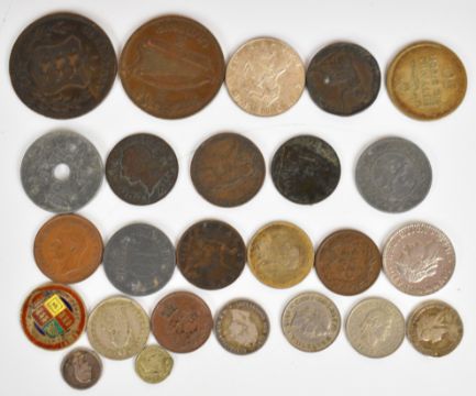 Small collection of mostly 19th and 20th century Great Britain and world coins, tokens and commemorative medals including silver coins from Switzerland, Palestine, South Africa and the United States of America, an 1853 Victoria Great Britain Farthing, four Great Britain proof sets from 1970 and 1996, plus a set of collapsible sovereign/guinea scales.