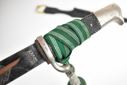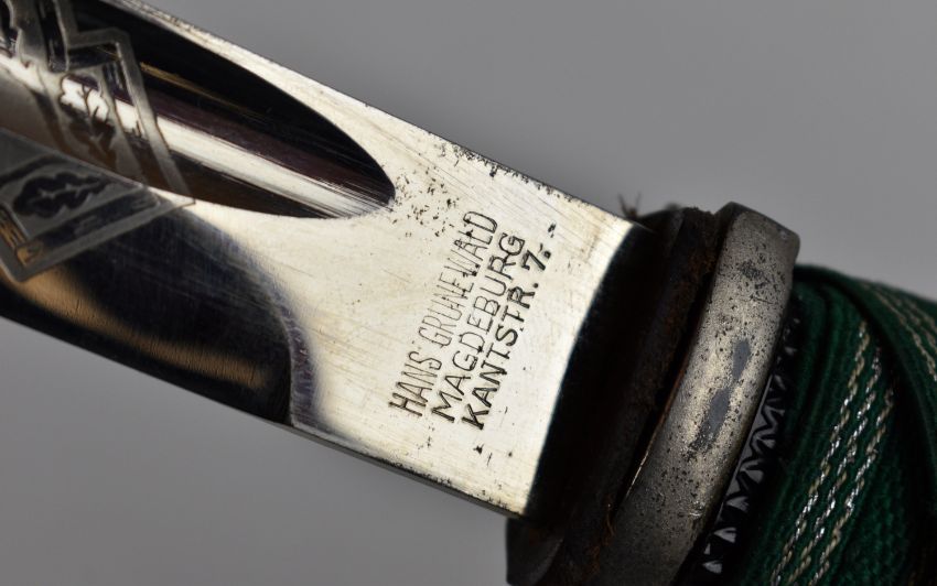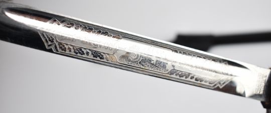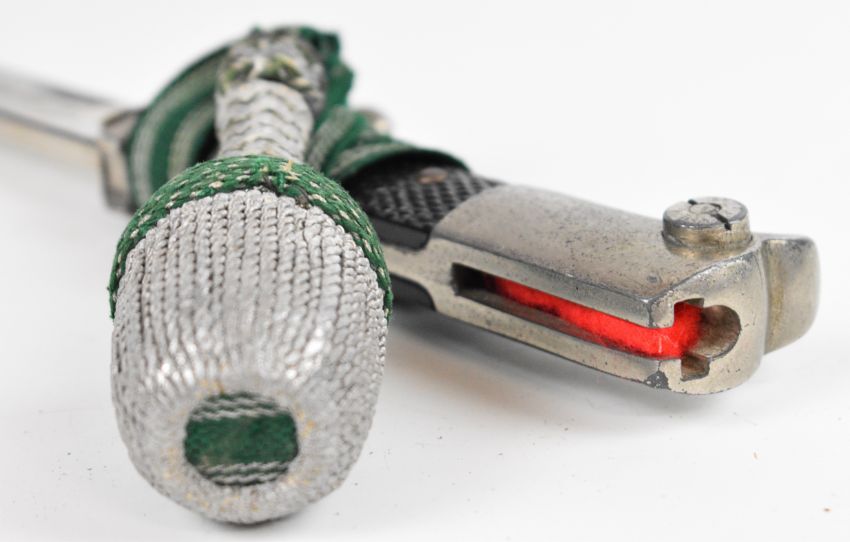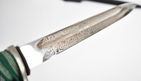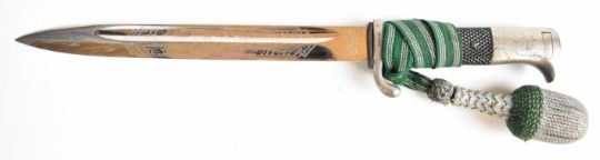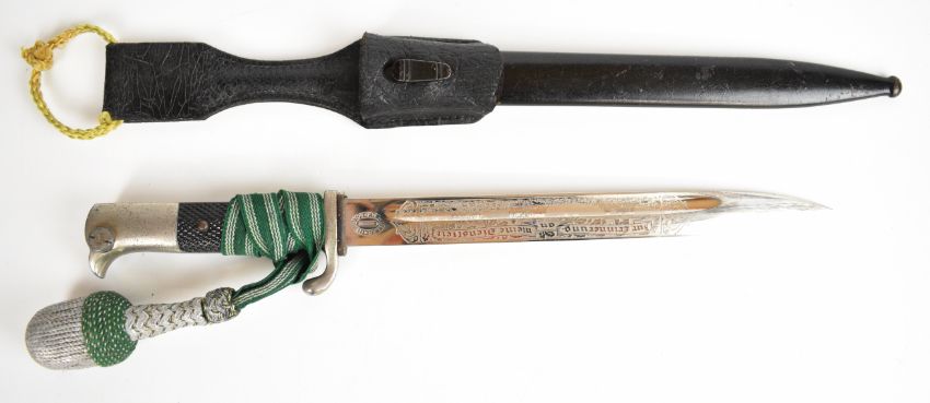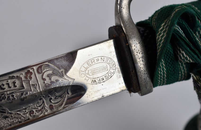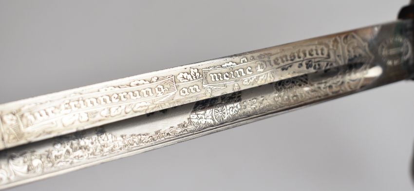 German parade bayonet the 24.5cm blade with etched design showing battle scenes and gothic text, 'Inf.Regt.66 Magdeburg' and 'Für Erinnerung an meine Dienstzeit', (in remembrance of my service time) with F.W. Höller, Solingen and Hans Grunewald, Magdeburg Kanstr 7, maker's mark to ricasso, two piece chequered black grip, with dress portepees / knot, pommel with releasing catch, in blackened steel and scabbard and leather frog, overall length approximately 41cm. PLEASE NOTE: WE ARE NOT ABLE TO OFFER OUR USUAL POSTAGE SERVICE FOR THIS LOT