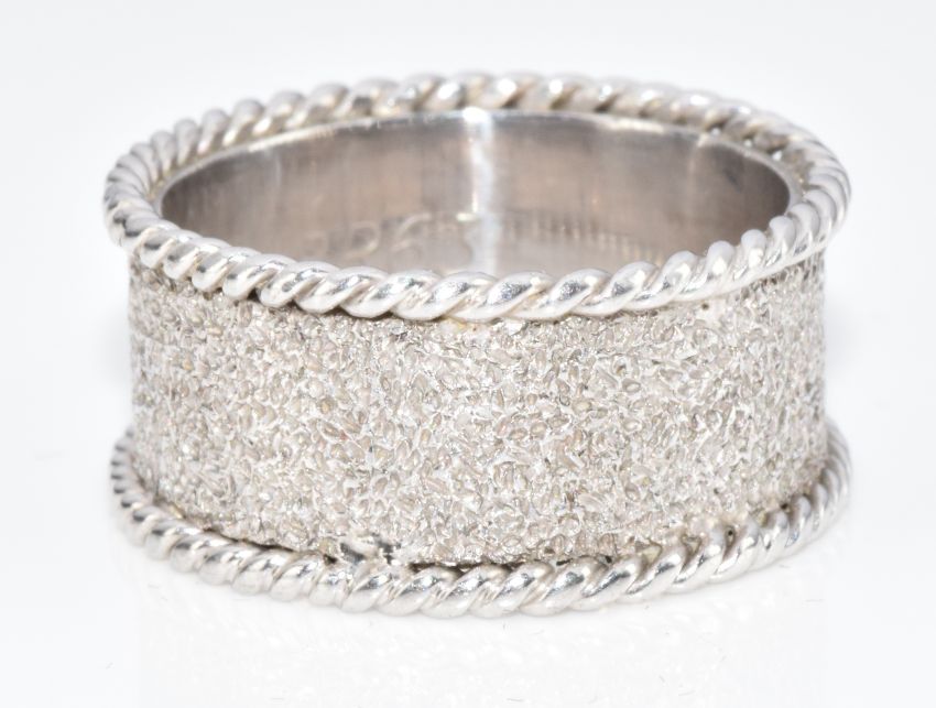 An 18ct white gold wedding band / ring with textured decoration and rope twist borders, 9.1g, size M/N