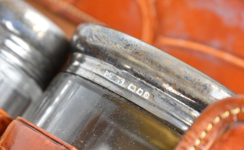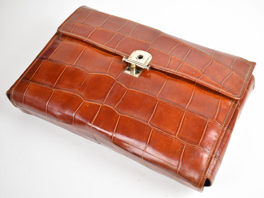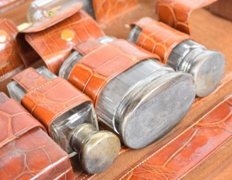 Early 20th century gentleman's travelling vanity set in crocodile skin fold out case, including hallmarked silver topped bottles, London 1928, maker's mark G C & S, folding mirror, faux ivory shaving brush and scissors, width of case 31cm