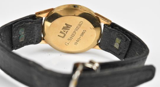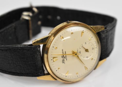 J W Benson 9ct gold gentleman's wristwatch with inset subsidiary seconds dial, gold hands and hour markers, silver dial and signed 18 jewel movement, on black leather strap, case diameter 32mm, serial number 053848.