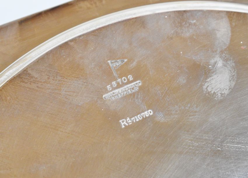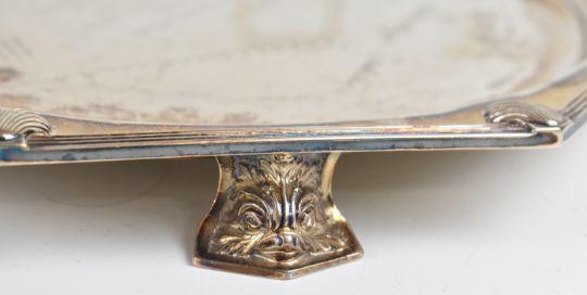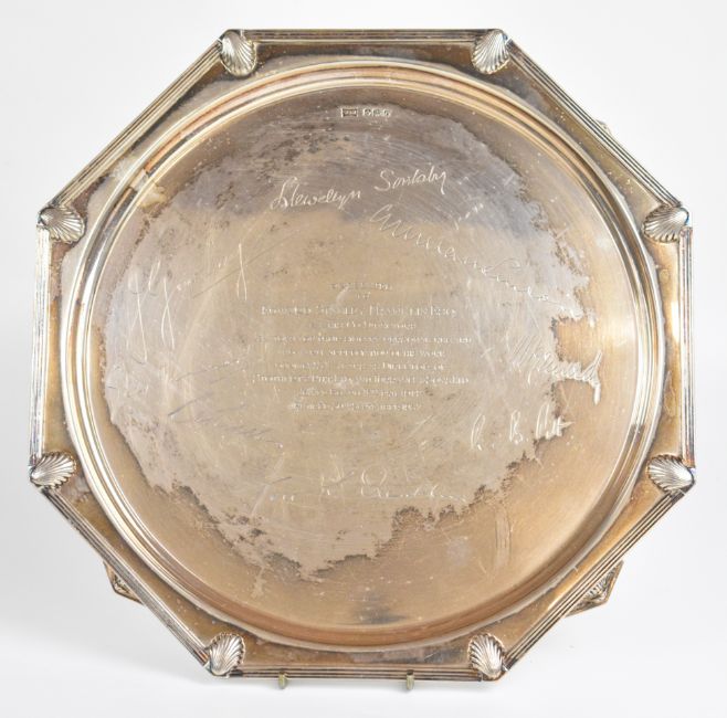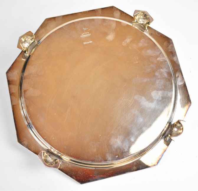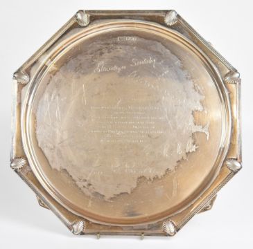 Art Deco Walker & Hall octagonal hallmarked silver salver or tray with shell decoration to the corners, raised on four feet formed as fish, with Stotherd & Pitt Ltd and Torrence & Sons Ltd engineering interest inscription, Sheffield 1931, width 28cm, weight 862g