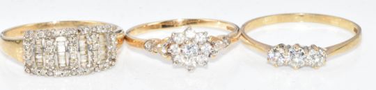 Three 9ct gold rings, one set with round and baguette cut diamonds and the other two cubic zirconia, 6g, sizes U, R & V