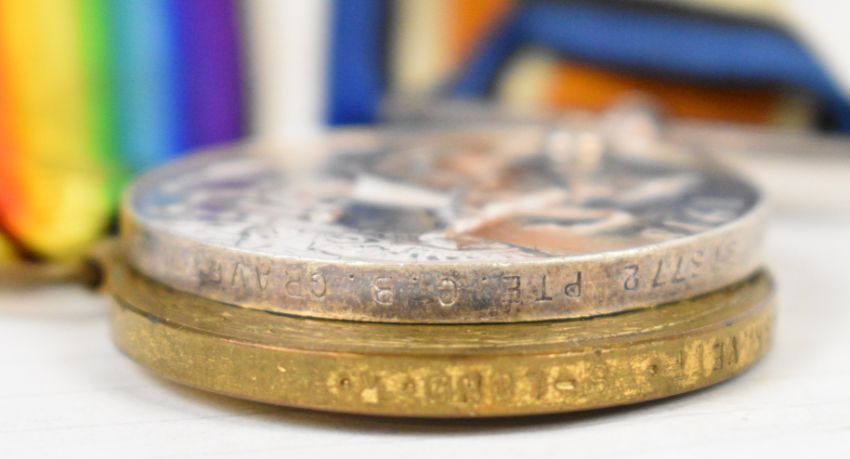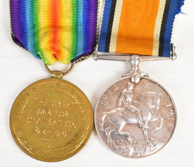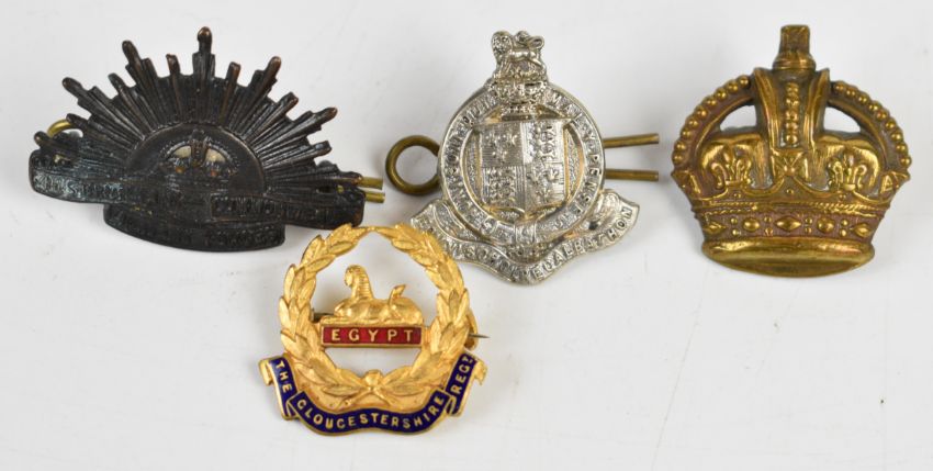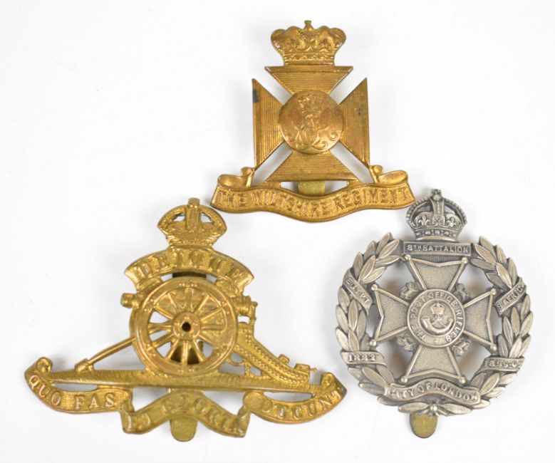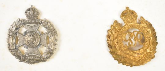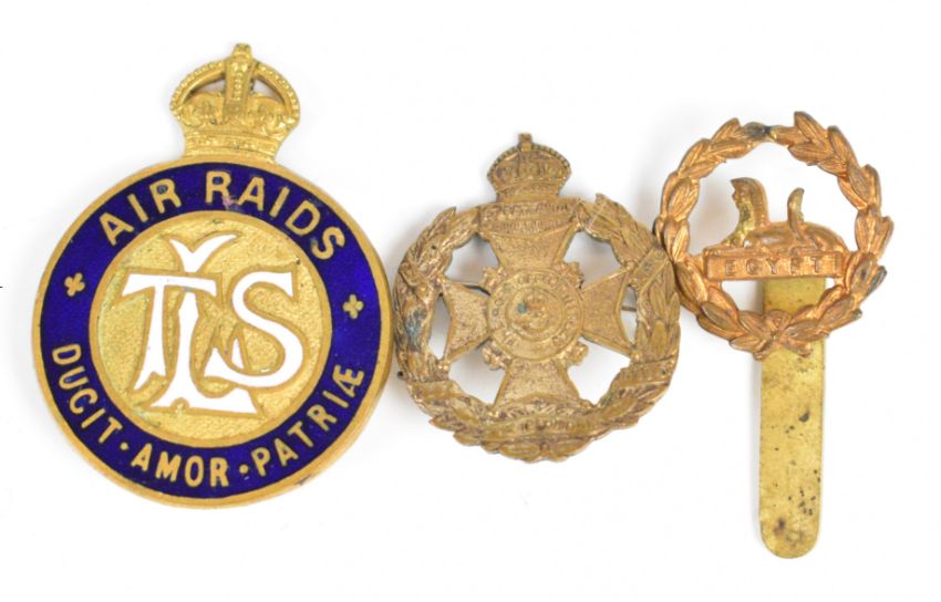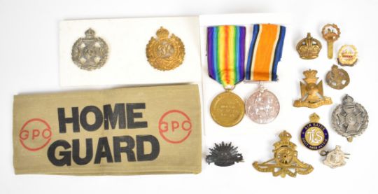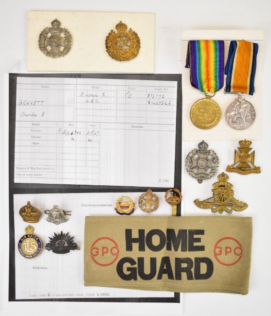 Pair of WW1 War and Victory Medals named to 373772 Pte C.B. Gravett (Charles. B. Gravett) 8 Lond R (London Rifles) - (8th Battalion London Regiment or Post Office Rifles) together with London Telephone Service (TLS) Air Raids gilt and enamel GPO badge, cap badges for 8th Battalion of London Regiment (two examples), British Army Rifle Brigade, Royal Engineers, Royal Artillery, Gloucestershire Regiment (back badge), gilt and enamel Gloucestershire sweetheart brooch, King's Crown, King Edward’s School Bath (OTC) and an Australian Commonwealth Military Forces Rising Sun badge, together with a General Post Office (GPO) Home Guard cloth armband black print and red GPO stamps and his medal card. Provenance: Bath Postal Museum
