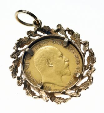 1910 gold half sovereign in 9ct gold acorn and oak leaf mount, 7.7g