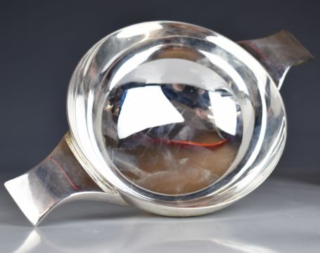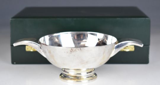 Elizabeth II hallmarked silver twin handled porringer or quaich, Birmingham 1970, maker Barker Ellis Silver Co, with case, width 20.5cm, weight 312g, width of case 25cm