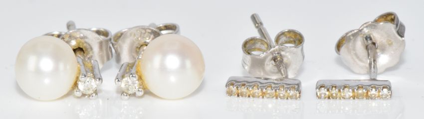 Two pairs of 9ct white gold earrings, one pair set with diamonds and the other a pearl and diamonds, 1.9g