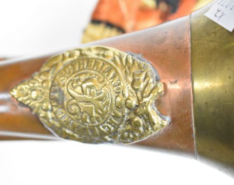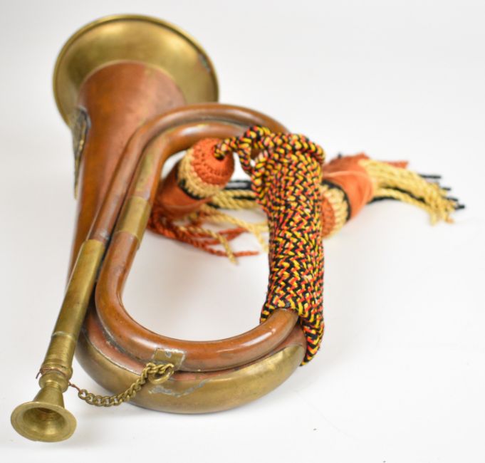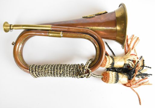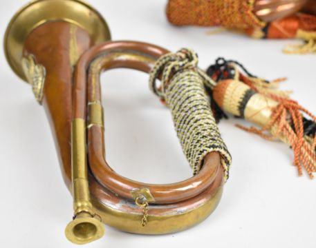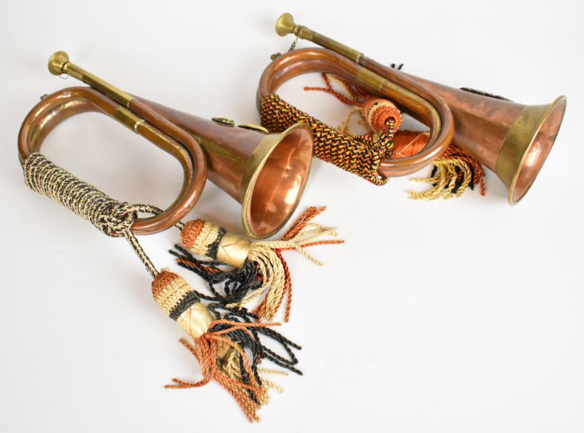 Two brass and copper military bugles, with ropes and knots and regimental insignia for the Argyll and Sutherland Highlanders and Royal Welsh Fusiliers