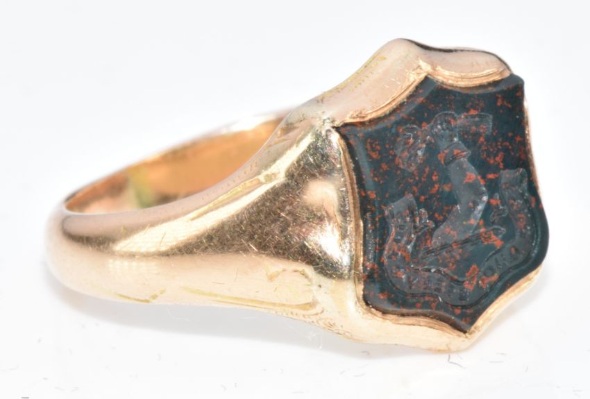 A c1900 yellow metal signet ring set with a bloodstone intaglio seal depicting a family crest reading 'esto quod esse videris' translating to 'be that which you seem to be', 3.7g, size N