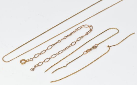 A 9ct gold chain (1.3g, 38cm) and two 9ct gold bracelets, 3.1g (damaged)