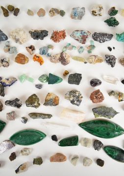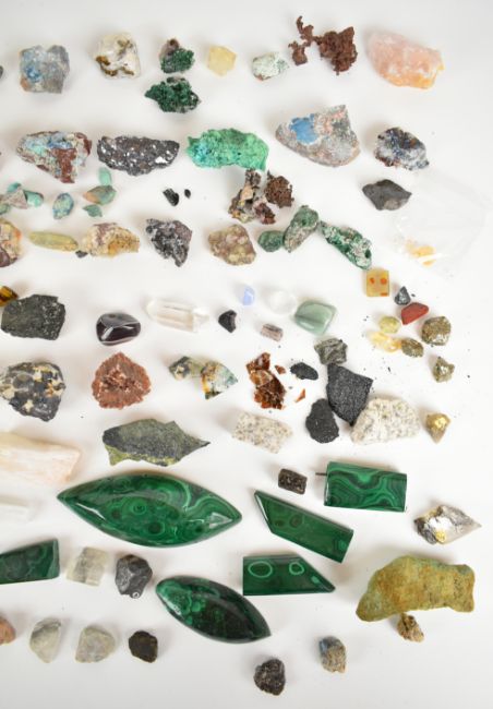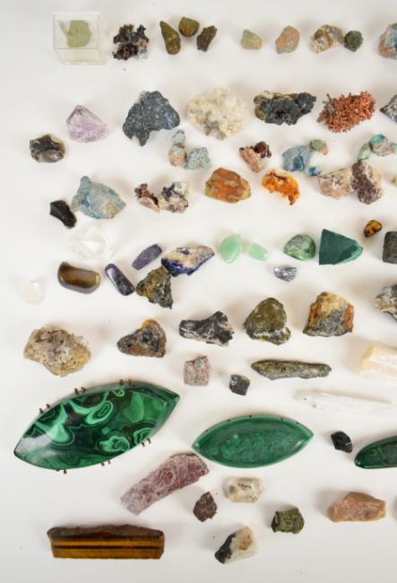 A collection of gemstones / mineral specimens including rose quartz, malachite, aventurine quartz, quartz, calcite, sphalerite, gypsum, etc
