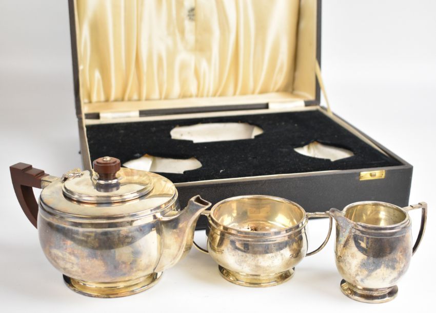 Art Deco hallmarked silver three piece teaset, the teapot having Bakelite or similar stepped handles, Birmingham 1946, maker Deakin & Francis Ltd, length of teapot 22cm, weight 623g all in, in original fitted case with T. Forbes Bulawayo (Zimbabwe) name to inside of lid, width of case 36.5cm