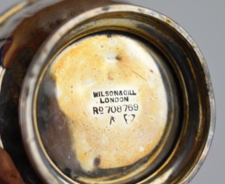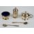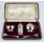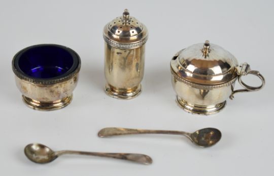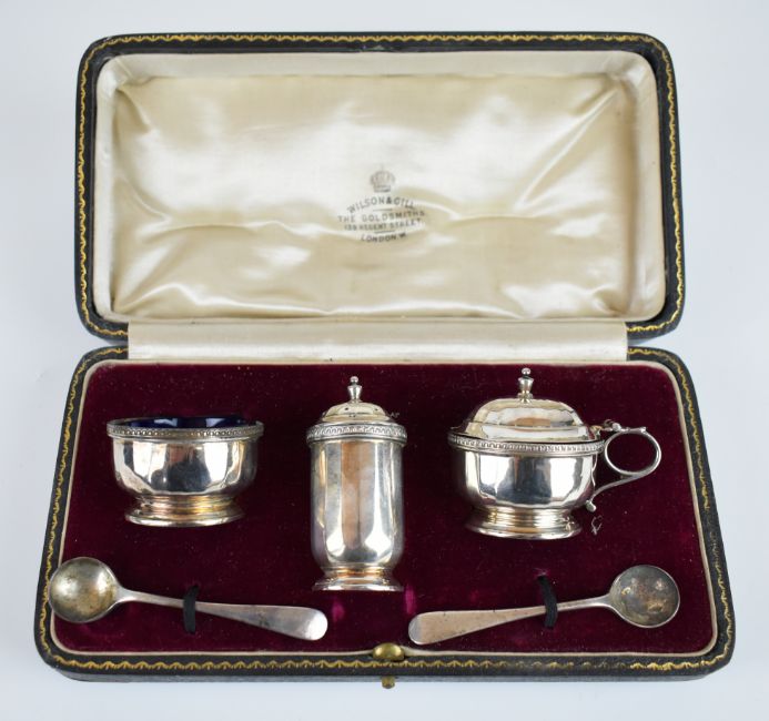 Art Deco hallmarked silver three piece cruet set comprising salt, pepper and mustard with two spoons to suit, the main pieces Birmingham 1925, maker Wilson & Gill, weight of all items excluding glass liners 106g, in original fitted box, length 21cm