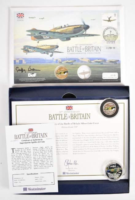 Three Battle of Britain proof silver coins comprising £5 and two £2, one in coin cover with section of Spitfire fuselage formed as the silhouette of a Spitfire, weight of all three 52g
