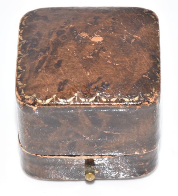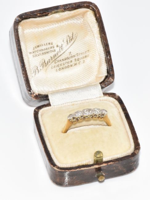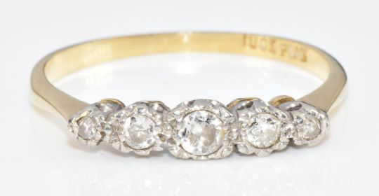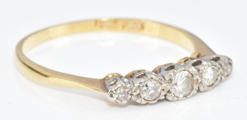 An 18ct gold ring set with five diamonds in a platinum setting, in antique box, 2.3g, size Q