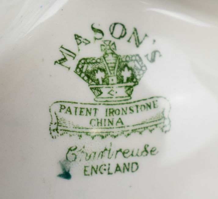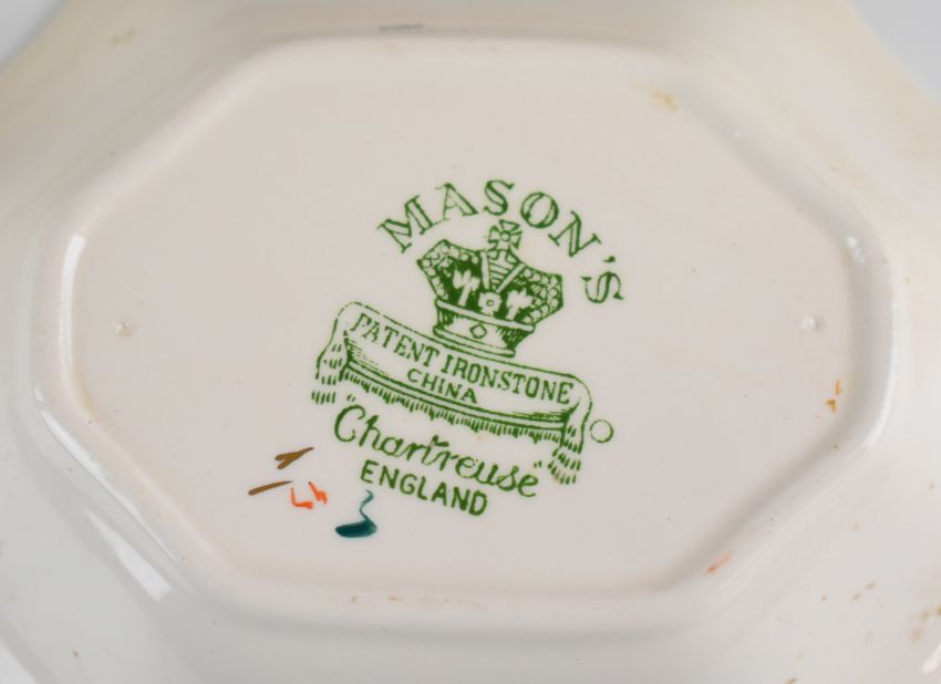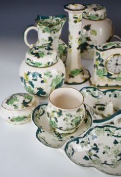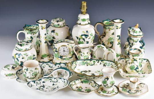 Mason's decorative ware decorated in the Chartreuse pattern to include clock, candlesticks, covered jars, jugs, lamp etc, approximately twenty three pieces