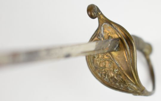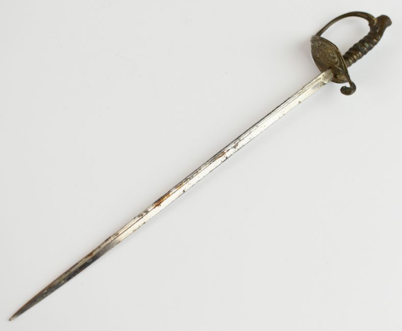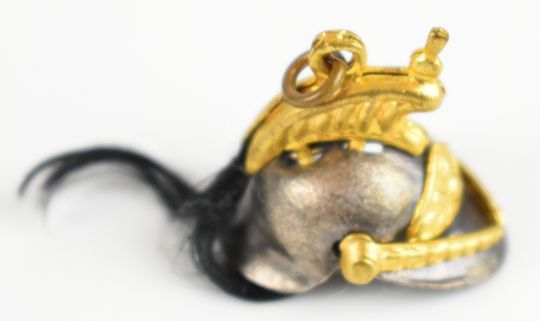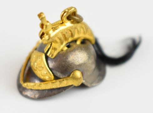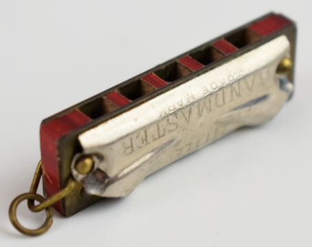 Miniature items including 19thC sword in scabbard with beaded chain, Grand Tour Roman helmet in French box, Turkish felt hat with silver wire embroidery decoration and a cased 'Little Bandmaster' mouth organ, the sword 23cm, helmet 2.5cm