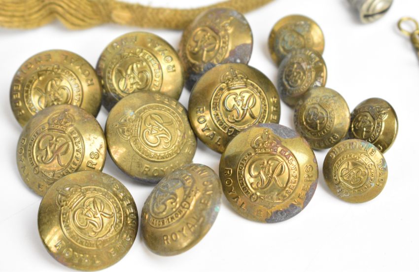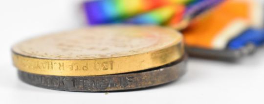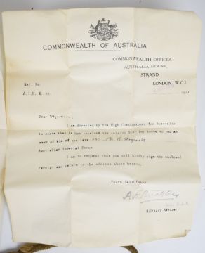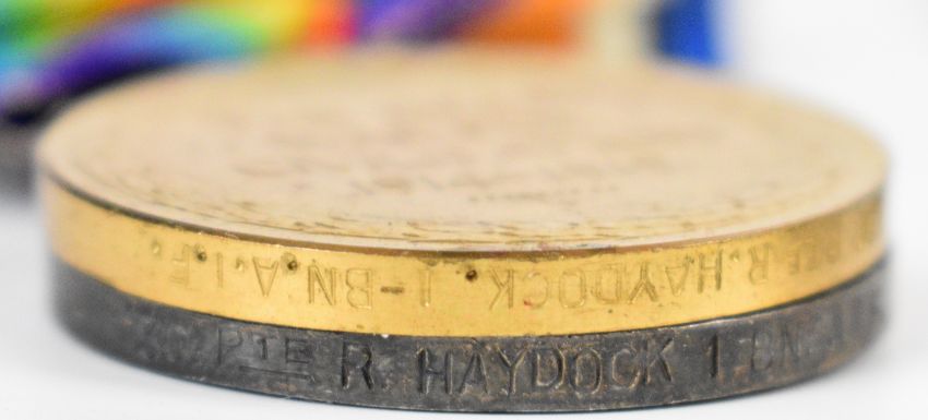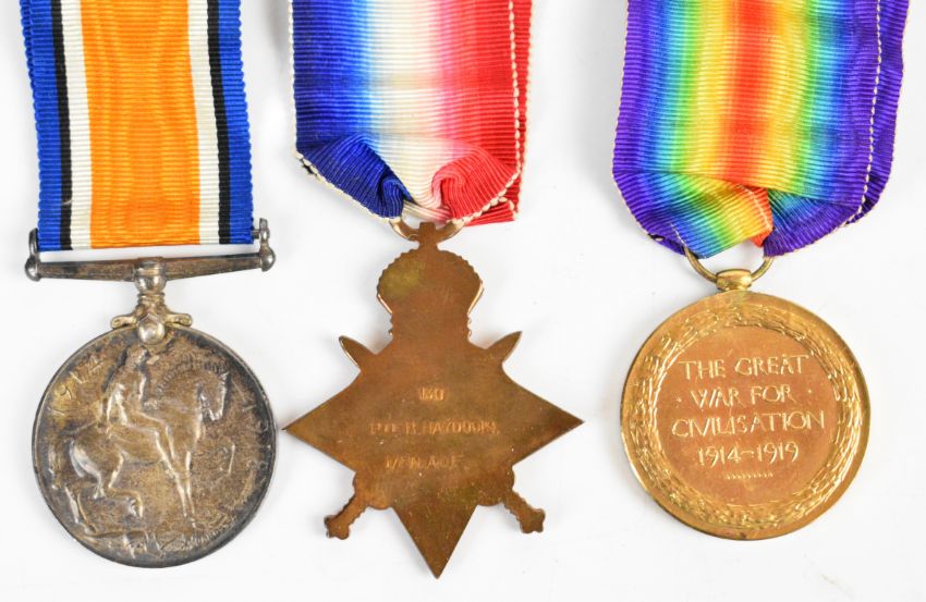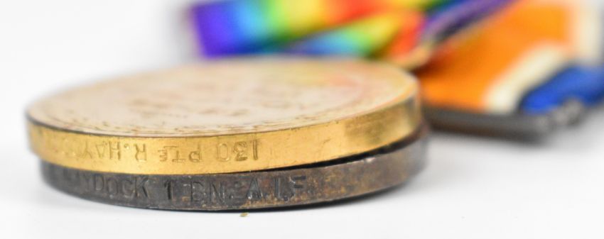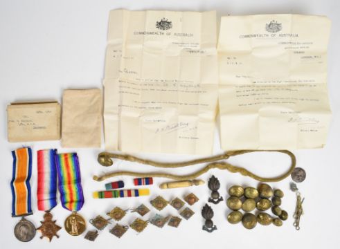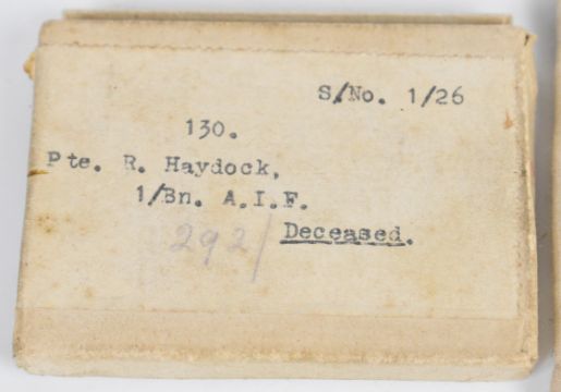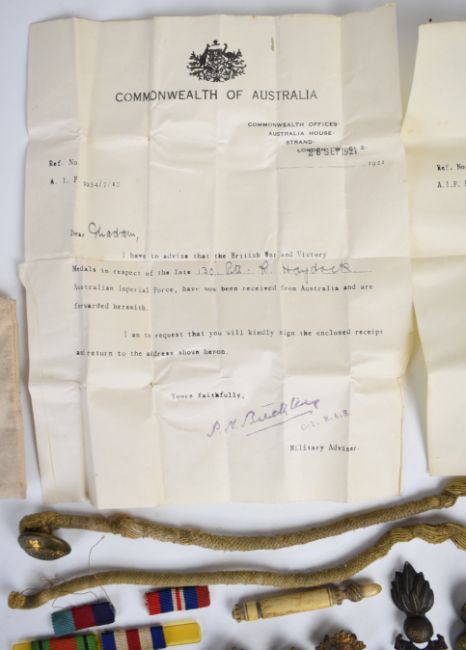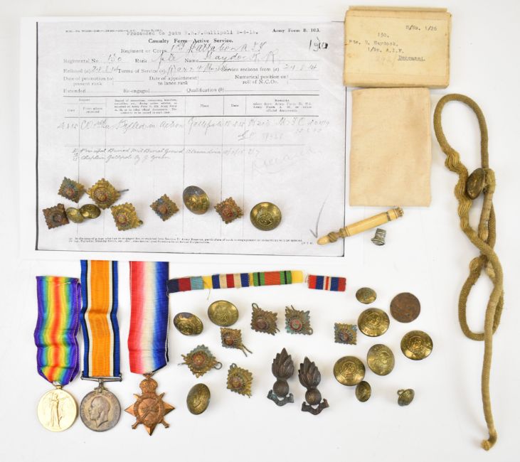 WW1 Australian Imperial Forces Gallipoli Casualty medal group comprising 1914-15 Star, British War Medal and Victory Medal named to 130 Pte. R. Haydock (Ralph Haydock), 1st Battalion Australian Imperial Forces (1/BN A.I.F.), together with box and paperwork from the Australian Commonwealth Offices dated 1921, with a quantity of Royal Engineers buttons, Royal Artillery badges, Officer pips, WW2 medal bar, carved bone item and copied research. Ralph Haydock was born in Salford, England and emigrated to Australia in 1912, joining the 1st Battalion, Australian Imperial Forces on the 24th August 1914, where he enlisted in Sydney and was killed in action on the 18th May 1915 during the Gallipoli Campaign (Dardanelles) and was buried at the Beach Cemetery, Gallipoli Peninsula, Türkiye (Anzac Cove).