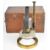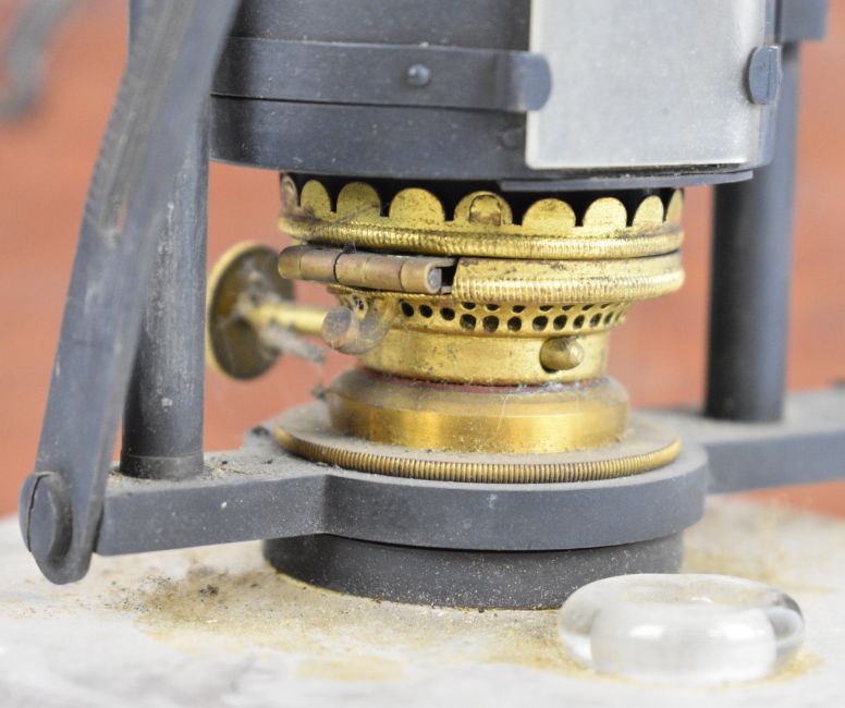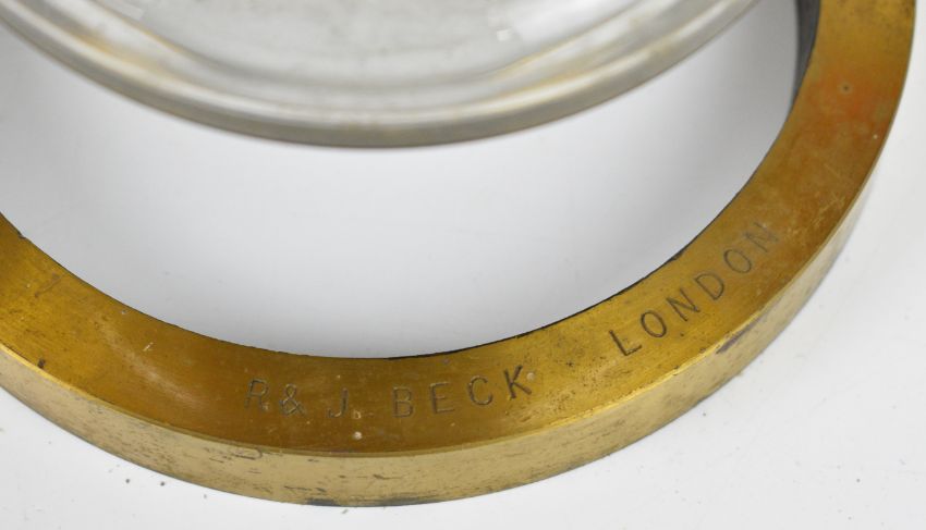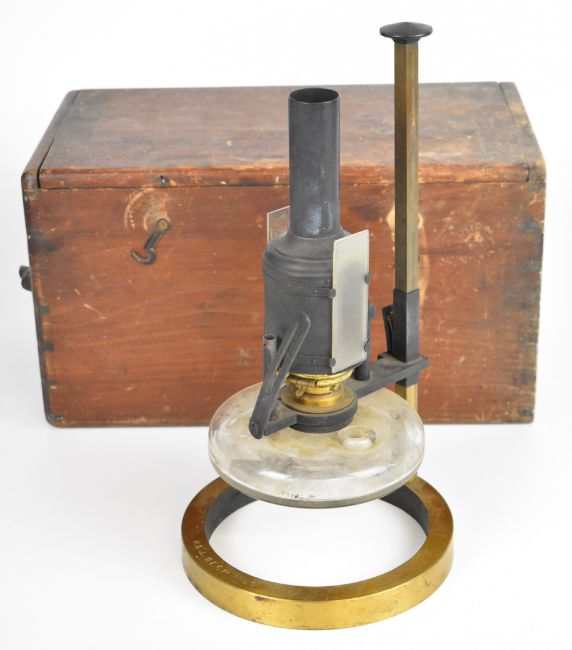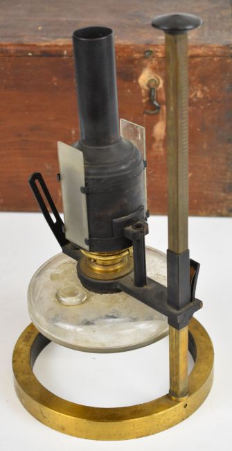 R & J Beck London brass and blacked metal microscope oil lamp with chimney or cover and graduated adjustable stem, in original mahogany case