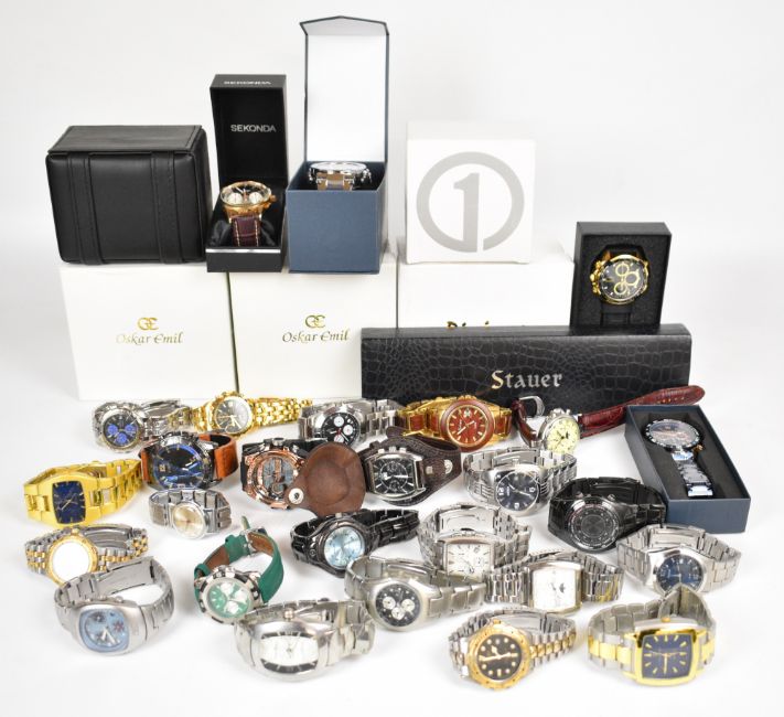 Thirty-two various gentleman's wristwatches including Stauer, Lige, Foxbox, Oskar Emil, Riviera, Ascot, Timex etc, some in original boxes.