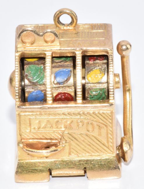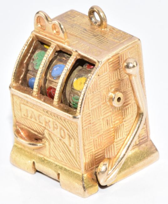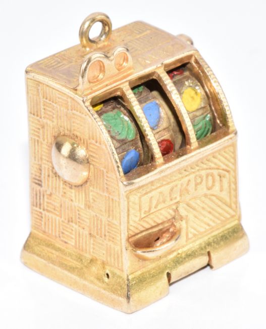 A 9ct gold charm / pendant in the form of a fruit machine, with working lever and wheels, 16.7g, 2.3cm