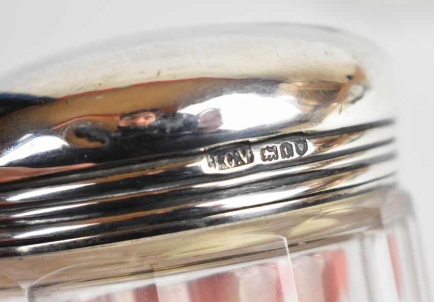 Two John Collard Vickery hallmarked silver topped cut glass dressing table pots, London 1913/14, height of taller 10cm, weight of both lids 57g