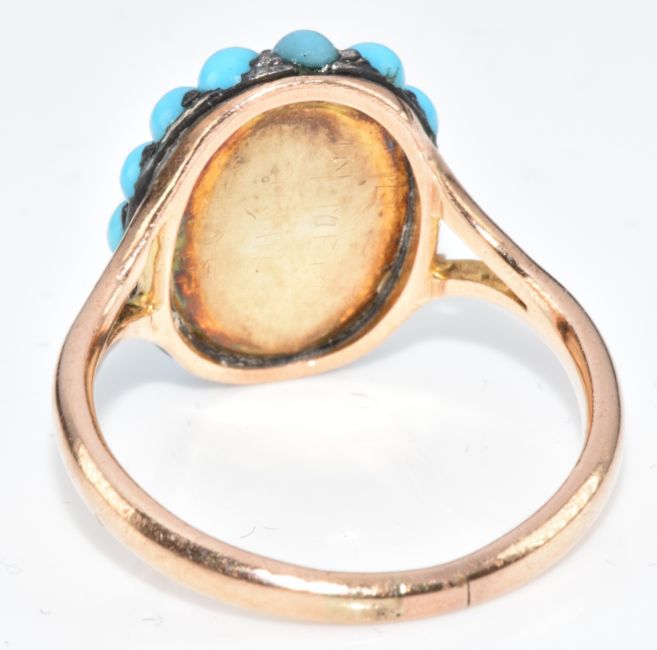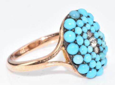 Victorian 9ct gold ring set with turquoise cabochons, rose cut diamonds and an old cut diamond, 3.5g, size I/J