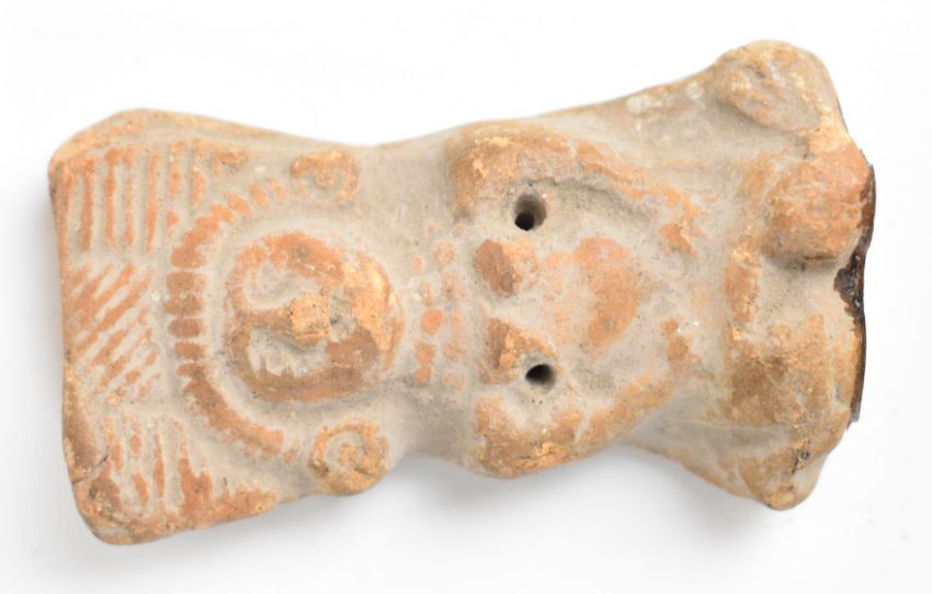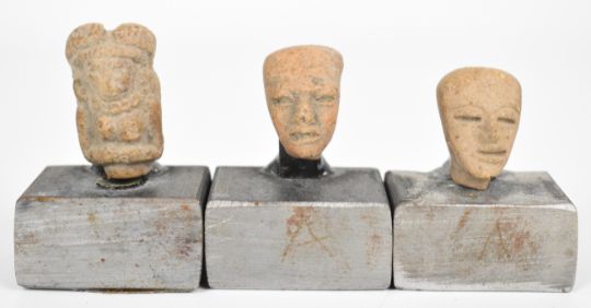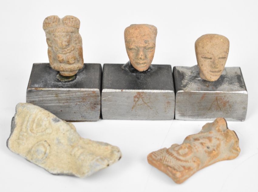 Five pre Colombian Mayan / Aztec pottery items including two votive masks, tallest 7cm