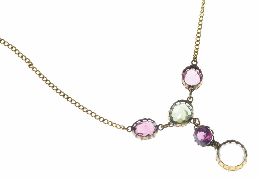 A c1910 9ct gold necklace with quartz, spinel and tourmaline, 4g, 43cm