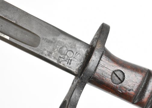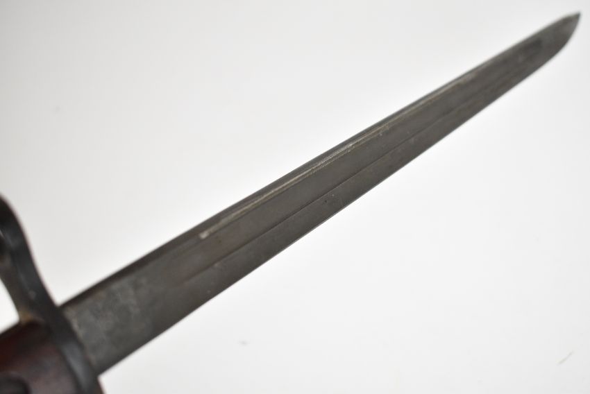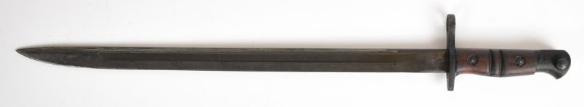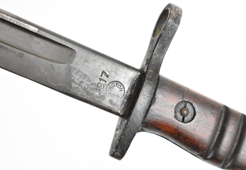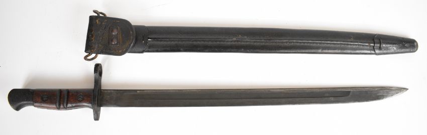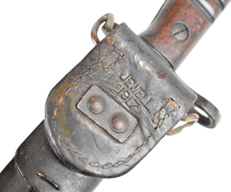 US Remington 1917 pattern bayonet the 43cm single fullered blade with sharpened point, with Remington's maker's mark dated 1917, inspection mark to the ricasso and leather scabbard marked Jewell 1917, overall length 58cm. PLEASE NOTE: WE ARE NOT ABLE TO OFFER OUR USUAL POSTAGE SERVICE FOR THIS LOT