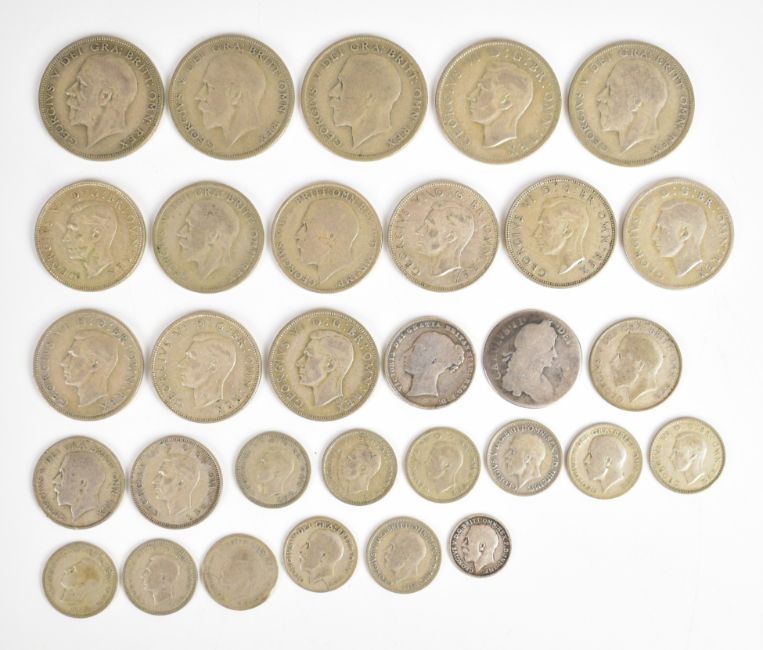 Approximately 215g pre 1947 British silver coinage together with a Charles II shilling, Victorian shilling and a George V 3d