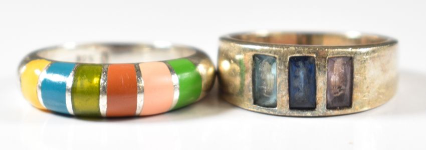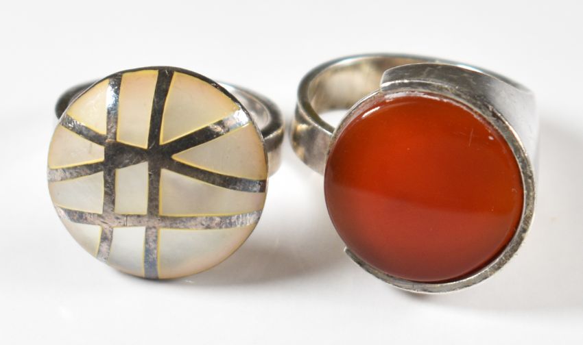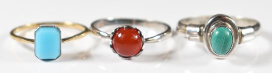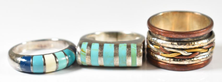 Nine silver rings including agate, mother of pearl, turquoise, etc and a 9ct gold and silver ring (1.5g)