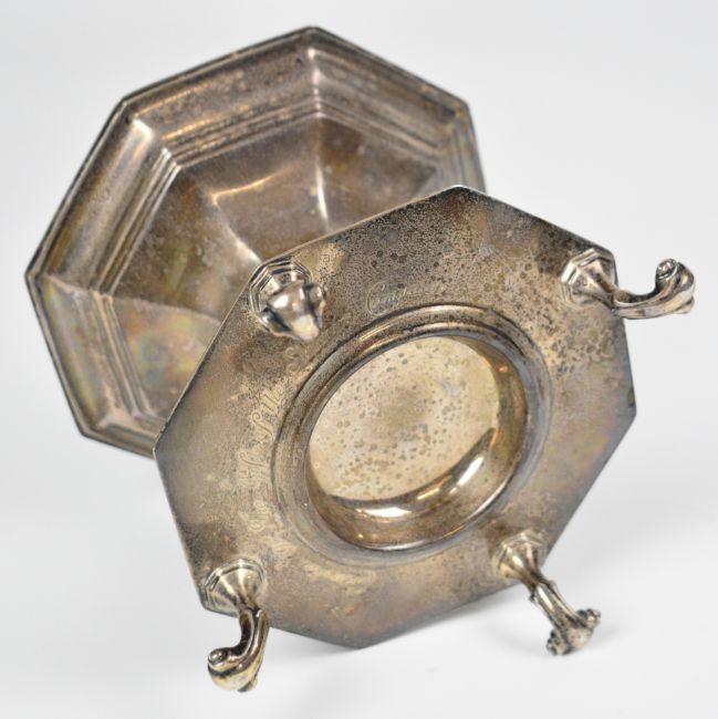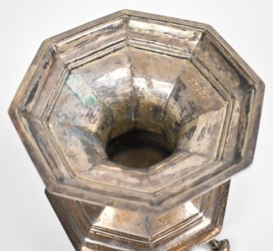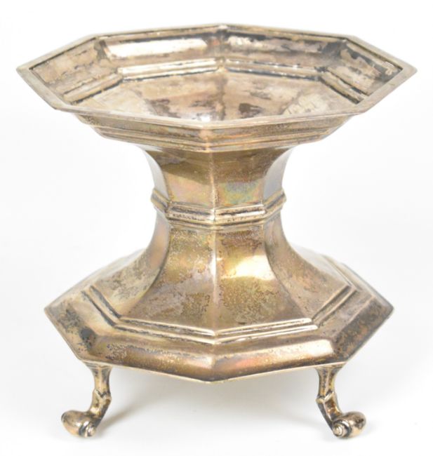 Edward VII or George V hallmarked silver octagonal stand raised on four scroll feet, with inscription to base Coronation 1911 The Gift Of The Skinners Company, London 1910, maker's mark rubbed, height 13.5cm, weight 504g