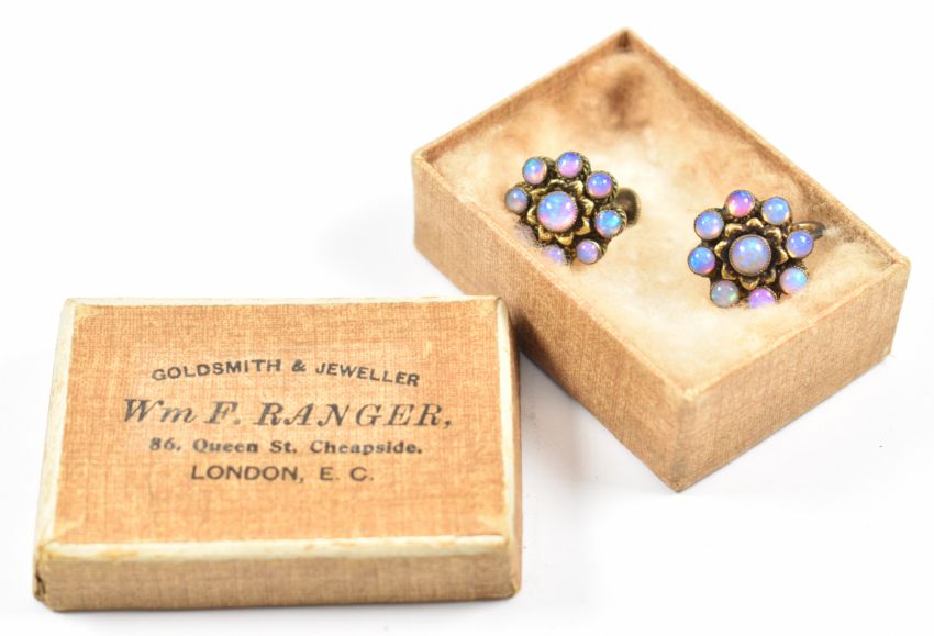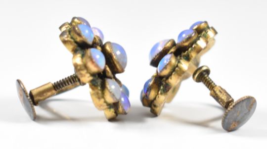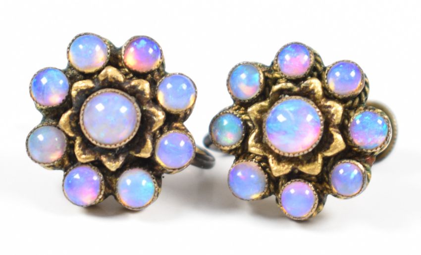 A pair of silver gilt earrings set with a cluster of black opals in foiled setting, diameter of cluster 14.3mm