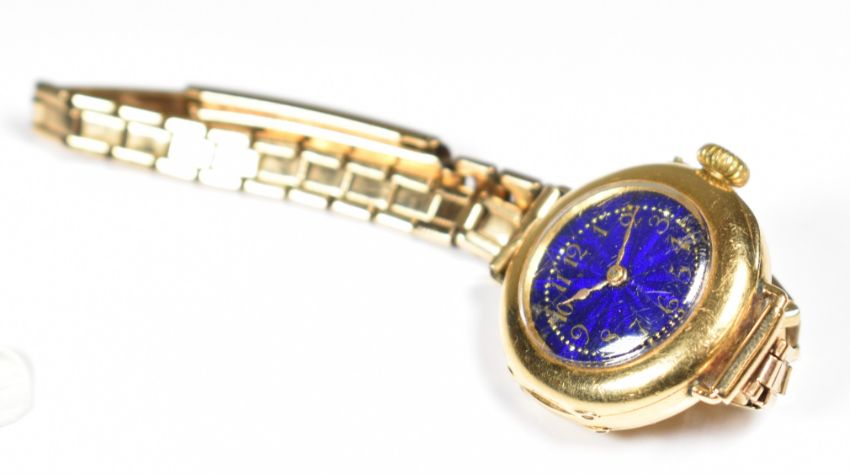 Le Roy & Fils 18ct gold ladies wristwatch with gold hands and Arabic numerals, blue enamel dial and unsigned movement, on 9ct gold bracelet, case diameter 24mm, 25.2g.