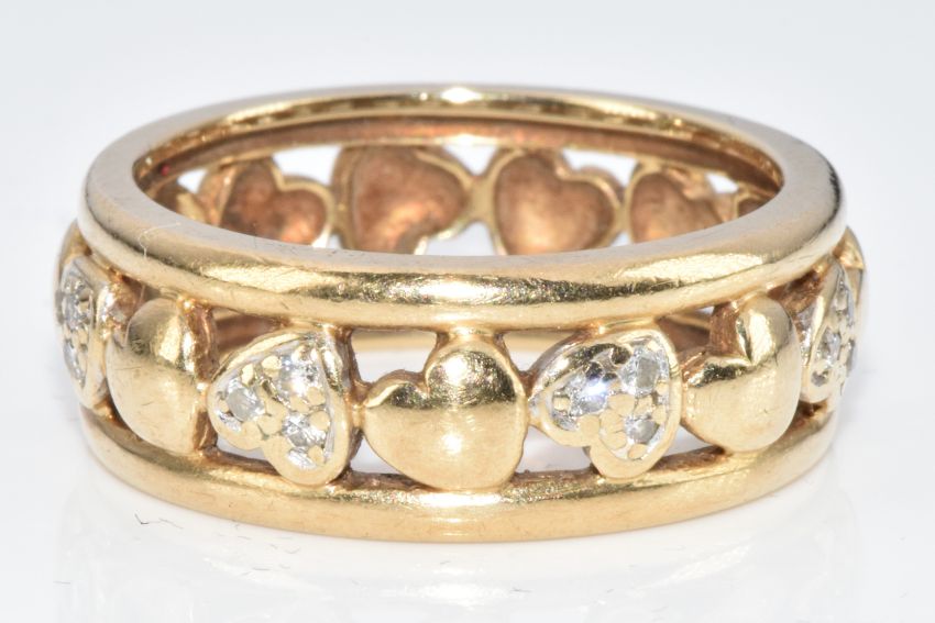 A 9ct gold ring with pierced heart decoration, five of the hearts set with diamonds (one diamond missing), 5.3g, size O