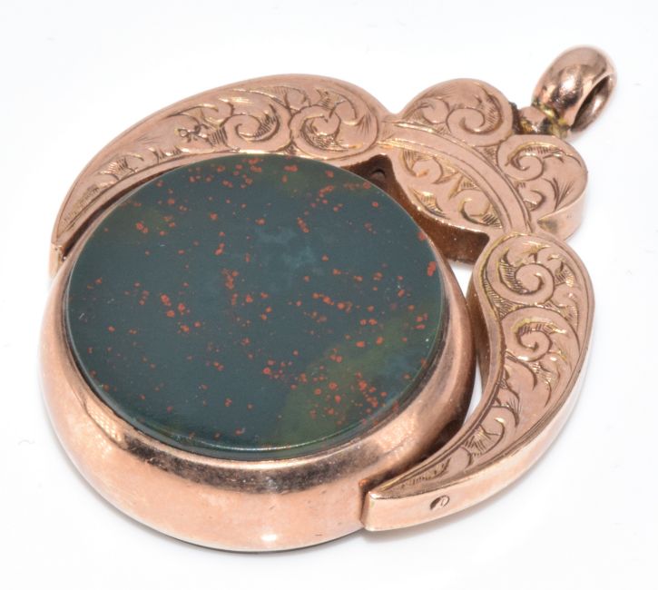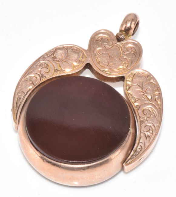 A c1900 9ct rose gold swivel fob set with bloodstone and carnelian agate, 7.9g