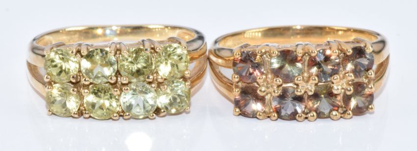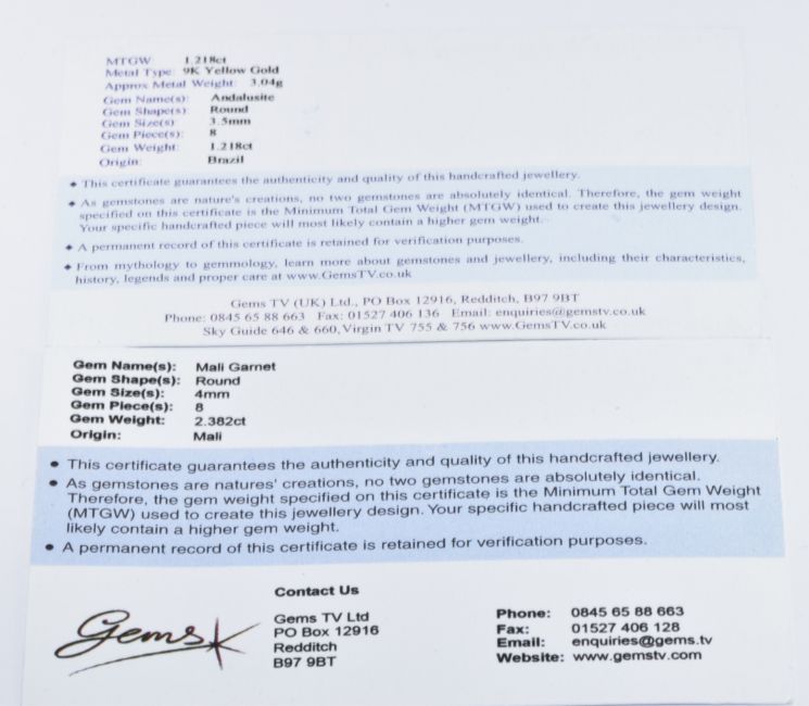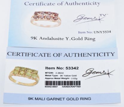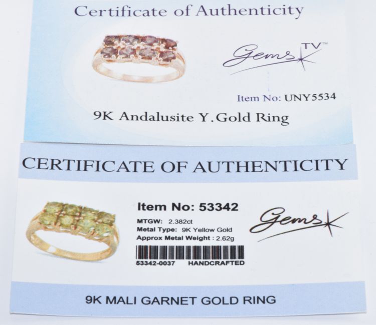Two 9ct gold rings, one set with andalusite and the other garnets, with certificates, 6.5g, size N