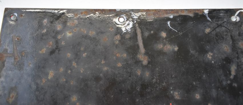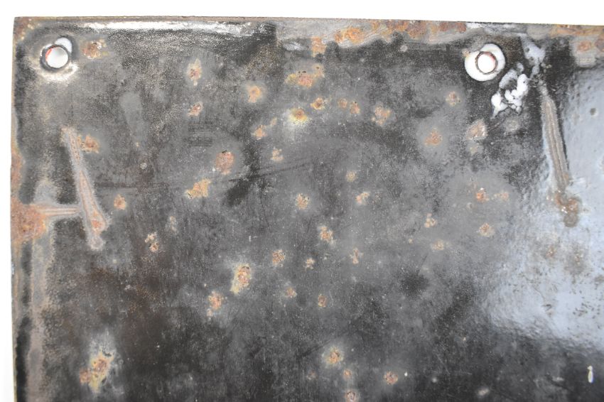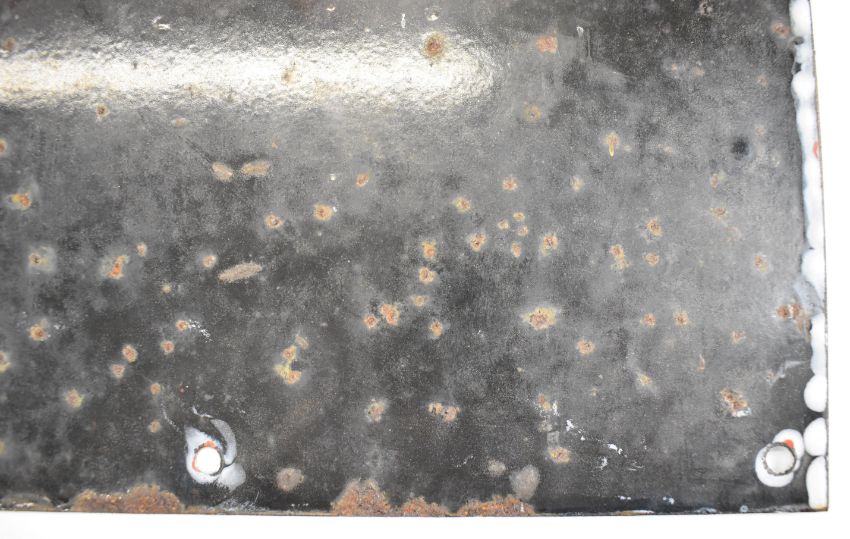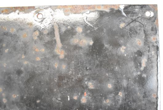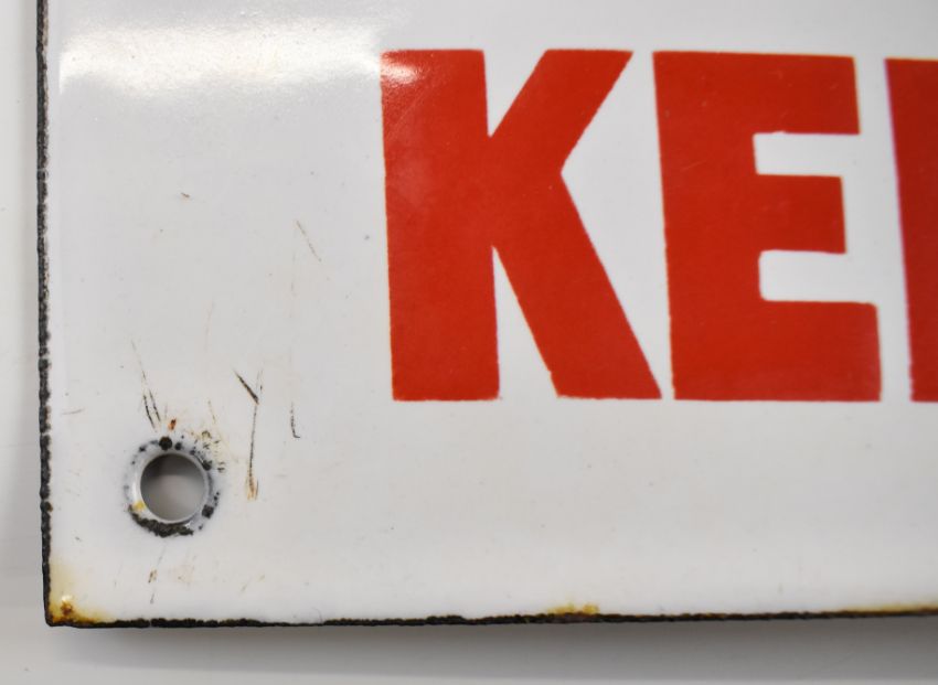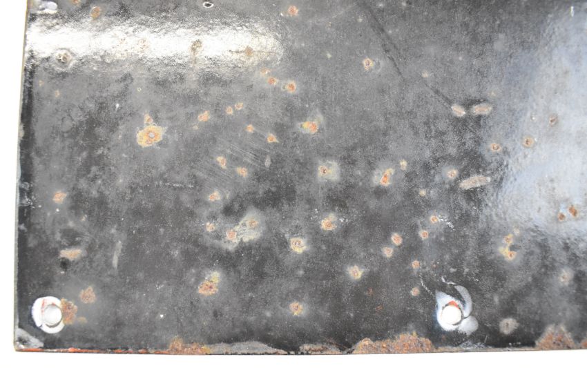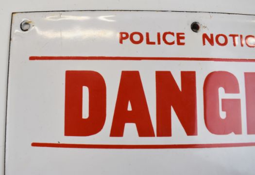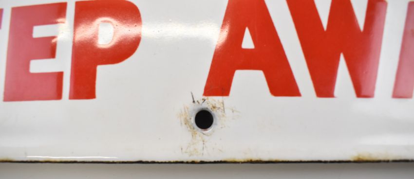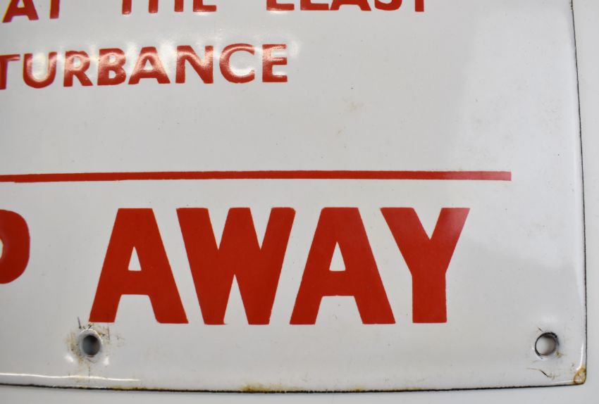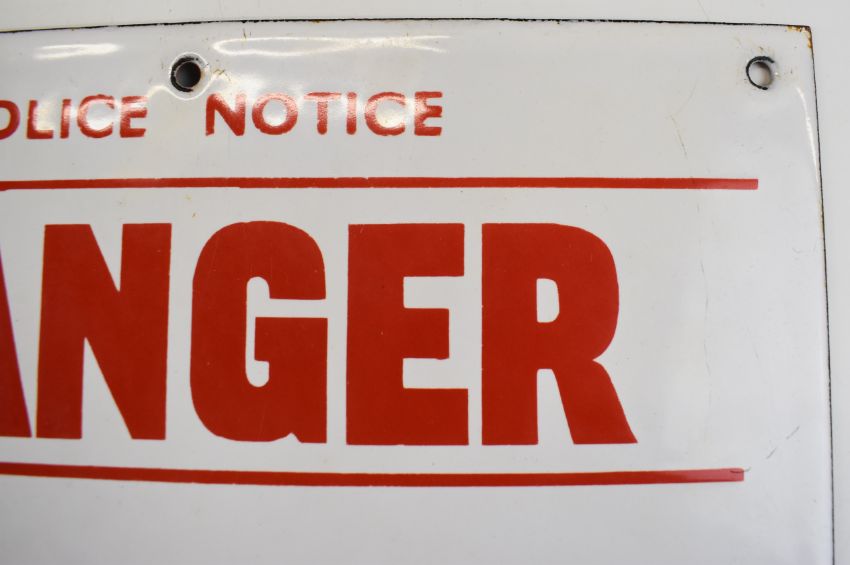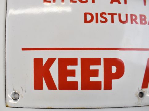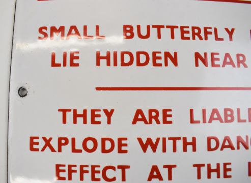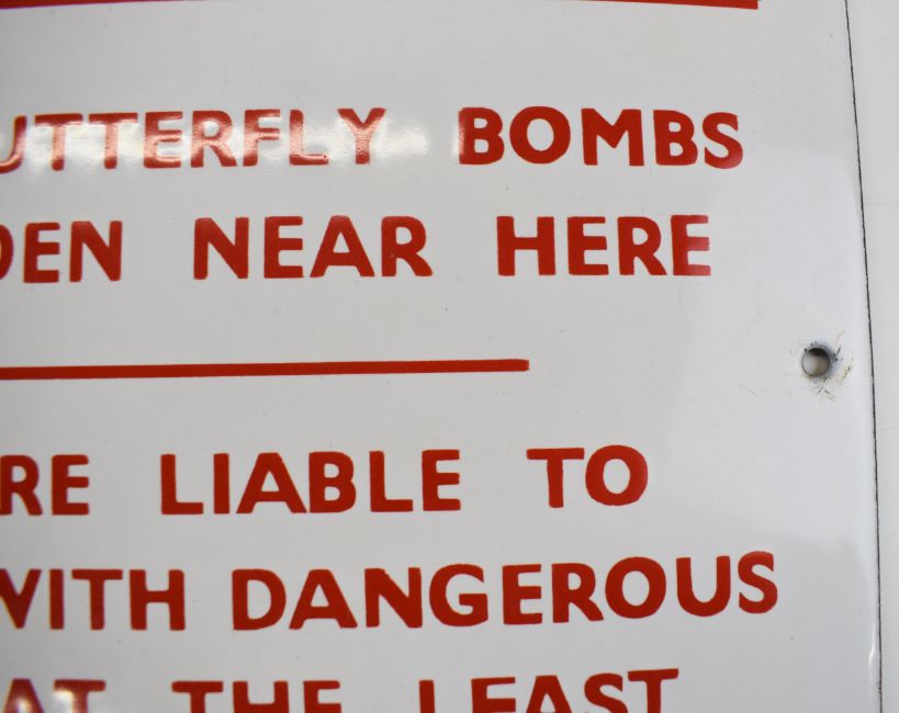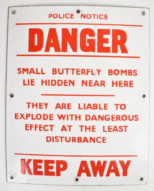 WW2 period enamel sign 'Police Notice - Danger - small butterfly bombs lay hidden near here - they are liable to explode with dangerous effect at the least disturbance - Keep Away', in red lettering on a white background, with eight hanging holes, 38 x 30.5cm
