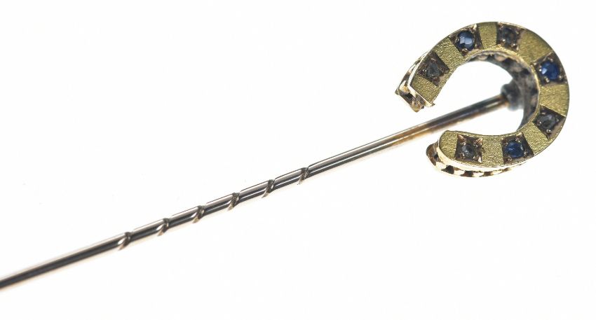 Victorian 15ct gold stick pin in the form of a horseshoe set with sapphires and diamonds, in antique box 'S.Ferris, Church Street, Calne', 1.6g