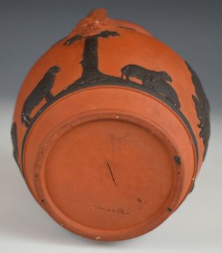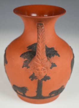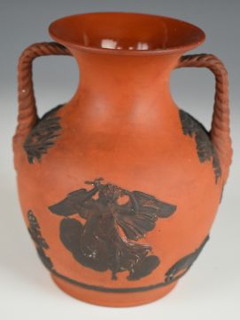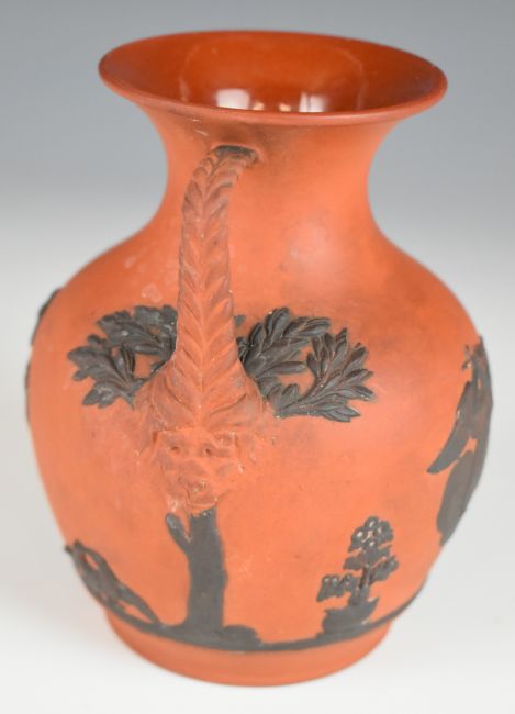 19thC Wedgwood Portland style twin handled vase with Rosso Antico decoration, H12cm