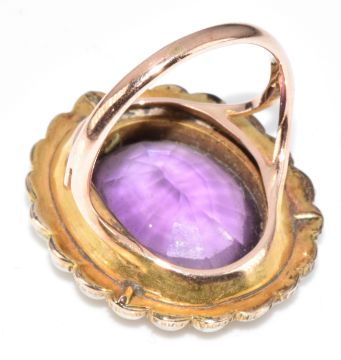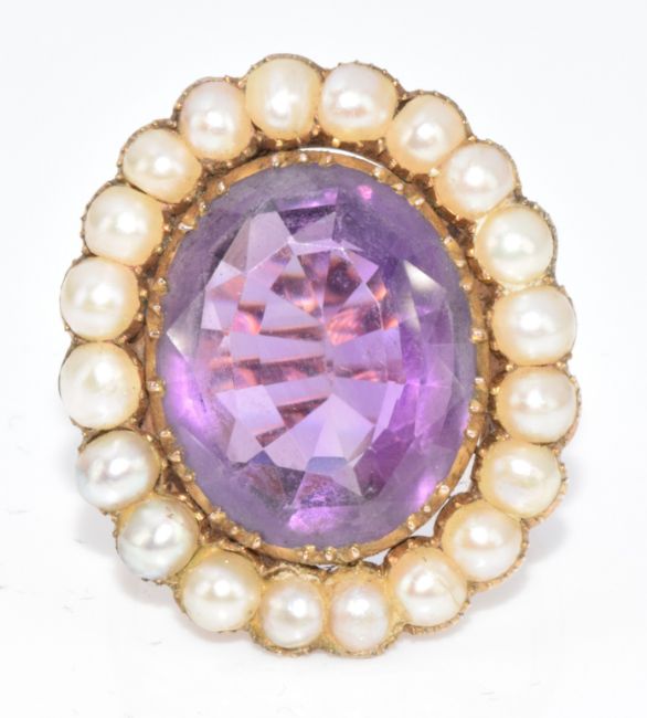 Edwardian 9ct gold ring set with an oval cut amethyst surrounded by split pearls, 6.3g, size K