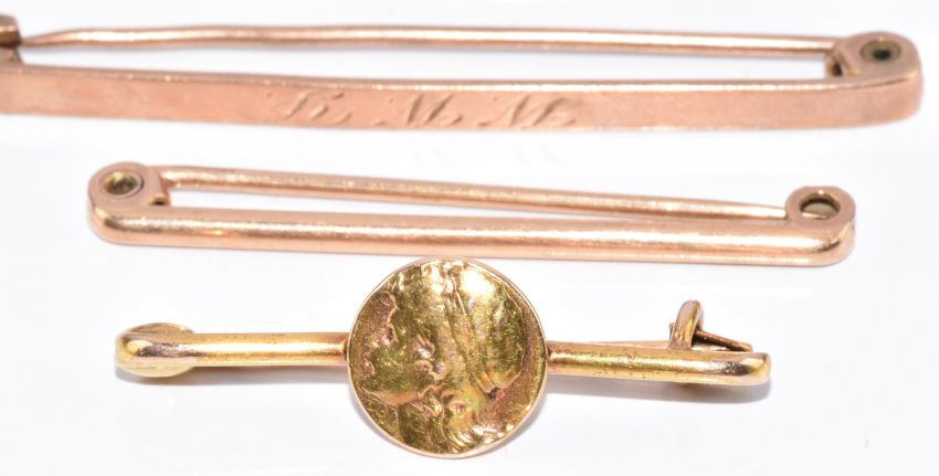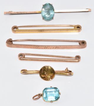 Three 9ct gold brooches (6.5g), 14ct gold brooch depicting a young woman (2.3g), a 9ct gold brooch set with paste (2g) and a 9ct gold pendant set with paste (0.9g)