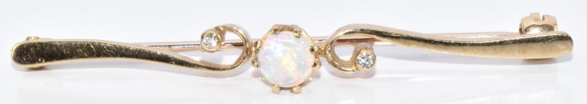 A 9ct gold bar brooch set with an opal and diamonds, 2.1g, 4.5cm